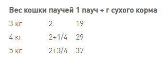 | Вес кошки ( кг) | Смешанное кормление ( 1 пакетик + г сухого корма) | Только влажный корм (пакетик г) |
