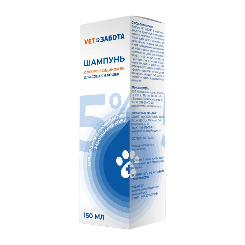 Шампунь vetзабота с хлоргексидином 5 % назначают собакам и кошкам с лечебной и профилактической целью при бактериальных (поверхностных и глубоких пиодерматитах), грибковых (малацезиозах и дерматофитозах), смешанных и атопических поражениях кожи и её производных. Хлоргексидин является дихлорсодержащим производным бигуанида, обладает выраженным противомикробным действием, активен в отношении вегетативных форм грамотрицательных и грамположительных бактерий, а также дрожжей, дерматофитов и липофильных вирусов.