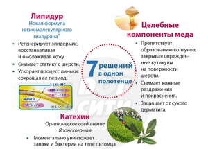 Благодаря входящим в состав ингредиентам полотенца являются универсальным уходовым средством за шерстью и кожей питомца. Катехин (органическое соединение японского чая) моментально уничтожает неприятные запахи и бактерии на шерсти и коже питомца. Липидур (новая формула низкомолекулярного гиалурона) ускоряет процесс линьки, сокращая её период, снимает статику с шерсти, регенерирует эпидермис, восстанавливая и омолаживая кожу. Входящие в состав целебные компоненты меда препятствуют образованию колтунов, закрывая поверхность кутикулы на поверхности шерсти, снимают кожные раздражения и покраснения, защищают от сухого дерматита. Сетчатая структура полотенца облегчает процесс сбора отлинявшей шерсти с тела. Не смывают анти паразитарные препараты. Не требует использования воды. Абсолютно безопасно при попадании внутрь.
