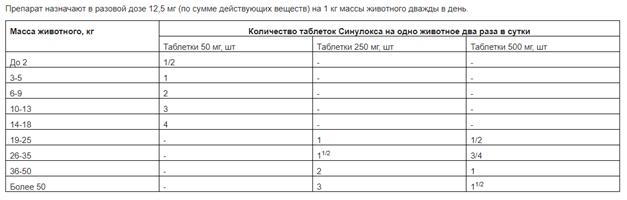 - таблетки Синулокс 500 мг назначаются крупным собакам, дозировка рассчитывается по весу (см. таблицу);