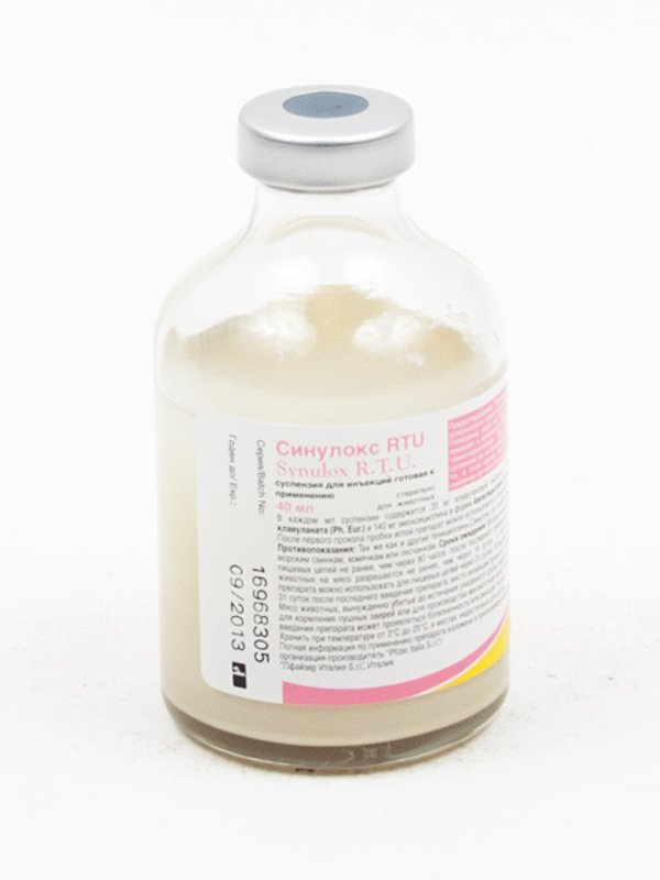 Ветпрепарат Synulox для инъекций выглядит как суспензия бледно-кремового цвета. Прежде чем набрать Синулокс в шприц, необходимо взболтать раствор до однородного состояния. После прокола пробки иглой, раствор можно использовать в течение 28 дней. Допустимая температура хранения: 3-25С.