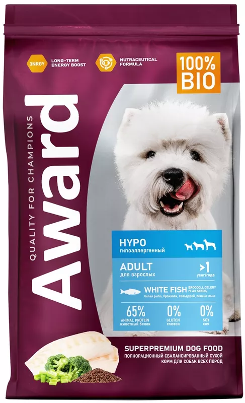 Сухой корм Award Hypo — представитель рационов премиум класса, разработанный компанией ЛимКорм Петфуд для собак всех пород. Он является гипоаллергенным и полнорационным, то есть содержит все необходимое для ежедневного комфорта питомца. Введение в рацион питания Award Hypo позволяет собаке чувствовать себя сытой, для этого использована технология 3NRGY, а также получать не только энергию, но и полезные витамины и микроэлементы. В качестве ингредиентов в гипоаллергенном корме Авард Гипо присутствуют: