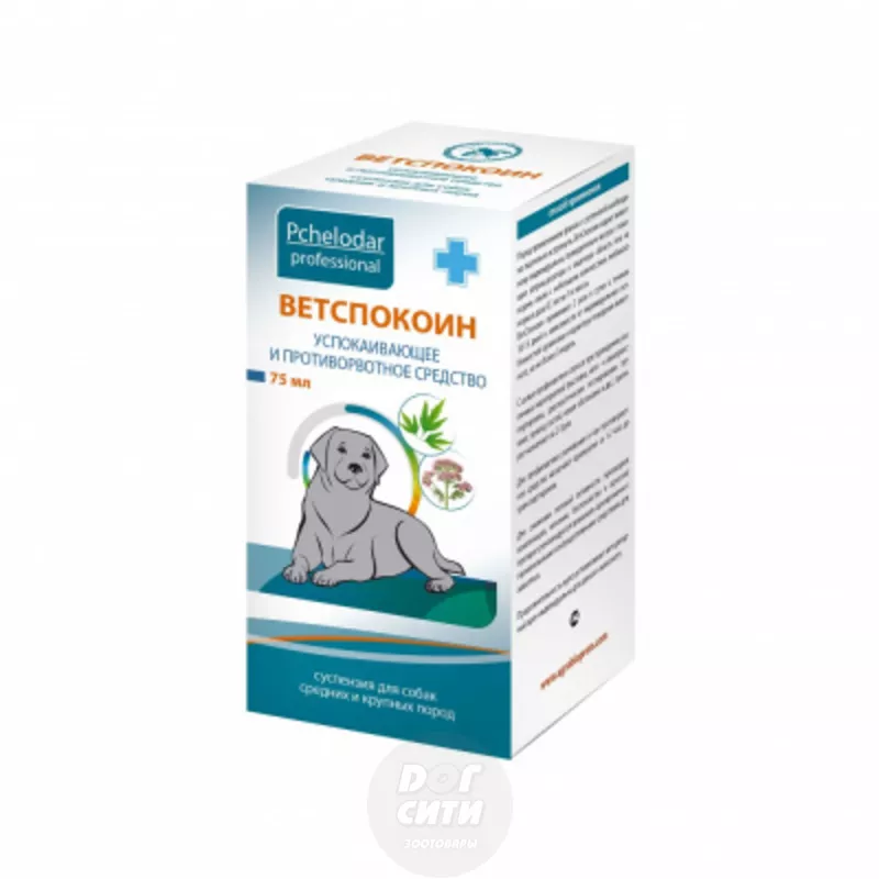 Pchelodar Ветспокоин суспензия для средних и крупных собак — эффективное успокаивающее и противорвотное средство для животных на основе фенибута, прометазина, экстрактов пустырника, валерианы и натурального пчелиного маточного молочка. Активные действующие вещества усиливают друг друга и оказывают мягкое седативное, противорвотное, спазмалитическое, стрессопротекторное и адаптогенное действие. Ветспокоин помогает нормализовать поведение животного (снизить агрессивность, повышенную боязливость), снять симптомы укачивания в транспорте (рвота, саливация, беспокойство и тд.), снизить проявления стресса и наладить межвидовые отношения. Натуральное маточное молочко содержит в своем составе витамины группы В, минеральные вещества, аминокислоты, ферменты и оказывает восстанавливающее и нормализующее действие на нервную, гормональную и эндокринную систему животного.