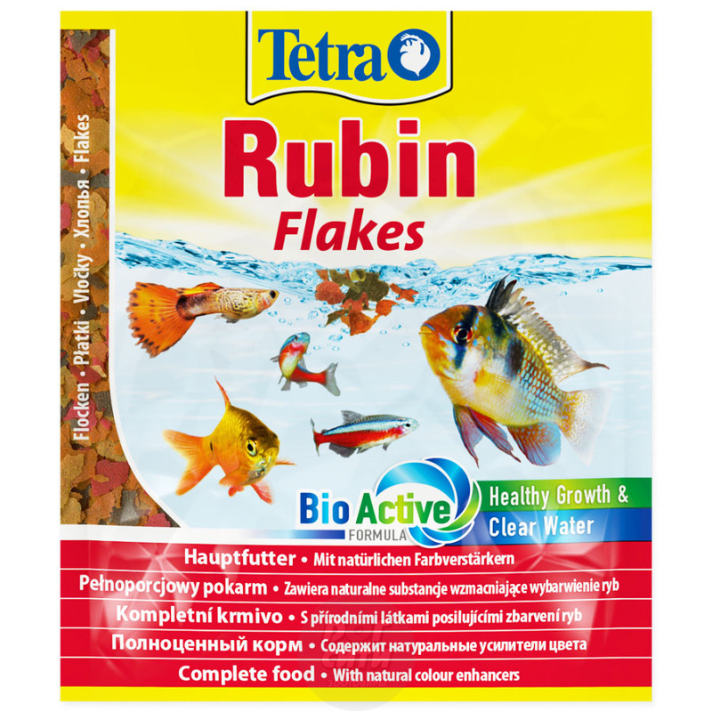 Тетра Рубин полноценный корм с натуральными усилителями цвета для ежедневного питания декоративных рыб любого размера в виде хлопьев.
