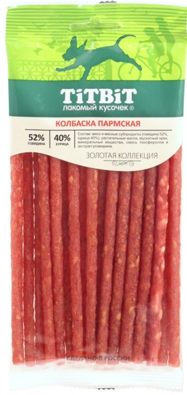 Золотая коллекция – это линейка лучших лакомств ТитБит, разработанных при участии владельцев домашних животных и их питомцев. Колбаса «Пармская» приготовлена из говядины и филе курицы и дополнена щепоткой мускатного ореха, придающего изысканность нежному вкусу.