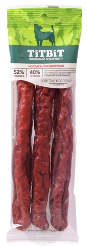 Золотая коллекция – это линейка лучших лакомств TITBIT, разработанных при участии владельцев домашних животных и их питомцев. Колбаса «Праздничная» считается элитой среди колбас для собак и излюбленным угощением четвероногих. Тщательно отобранная говядина с добавлением мяса ягненка лучшее угощение не только по особым случаям.