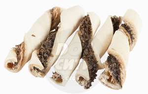 Высушенный завиток из говяжьей кожи с начинкой из рубца говяжьего. Благодаря большому содержанию аминокислот и коллагена положительно воздействует на хрящевую ткань, состояние кожи и шерсти собаки. Рубец улучшает аппетит, устраняет ферментную недостаточность и придает лакомству особый вкус, который так нравится собаке. Благодаря волокнистой структуре являются своеобразной зубной щёткой, способствующей укреплению дёсен, удалению зубного налёта и профилактике образования зубного камня.
