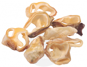 Упаковка содержит высушенные хрящевые основания говяжьих ушей. Высокое содержание коллагеновых и эластиновых волокон обеспечивает поступление в организм незаменимых компонентов для роста и поддержания качества хрящевой ткани суставов Вашего питомца. Рекомендовано с целью облегчения смены зубов у щенков, укрепления десен, очистки зубов от пищевого налета и зубного камня, дополнительного питания и укрепления хрящевой ткани собак среднего и старшего возраста. Высокое содержание коллагена и эластина способствует улучшению формирования ушного хряща для пород собак, стандартом которых предусмотрен вертикальный постав ушной раковины.