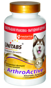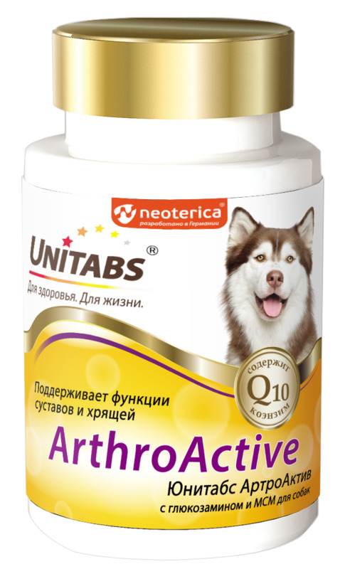 Unitabs ArthroActive снимает боль и укрепляет суставы и связки вашей собаки. Для крупной или тяжелой породы риск заболеваний связок и суставов очень высок. Поэтому щенкам крупных пород, спортивным породам и питомцам преклонного возраста нужно принимать хондропротекторы для укрепления связок и суставов. Именно таким средством является Unitabs ArthroActive - Юнитабс Артро Актив для собак.