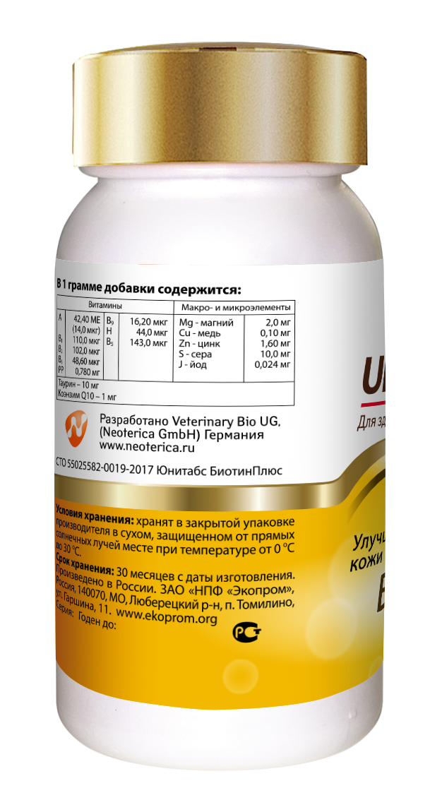 Формула Unitabs Biotin Plus будет отлично заботиться о кожно-шерстном покрове Вашего питомца. Витамин А обеспечит эластичность и гладкость кожи, поспособствует активному росту шерсти, устранит ее сухость и ломкость. Витамины группы В будут следить за регенерацией кожи, витамин Н, сера и цинк помогут синтезу кератина – основной субстанции эпителиальных клеток кожи и шерсти. Полезный таурин поддержит хорошее состояние волосков, а также позаботится о здоровье сердечно-сосудистой системы и органов зрения. А коэнзим Q10, выступающий природным антиоксидантом, повысит иммунитет и замедлит старение кошки на клеточном уровне.