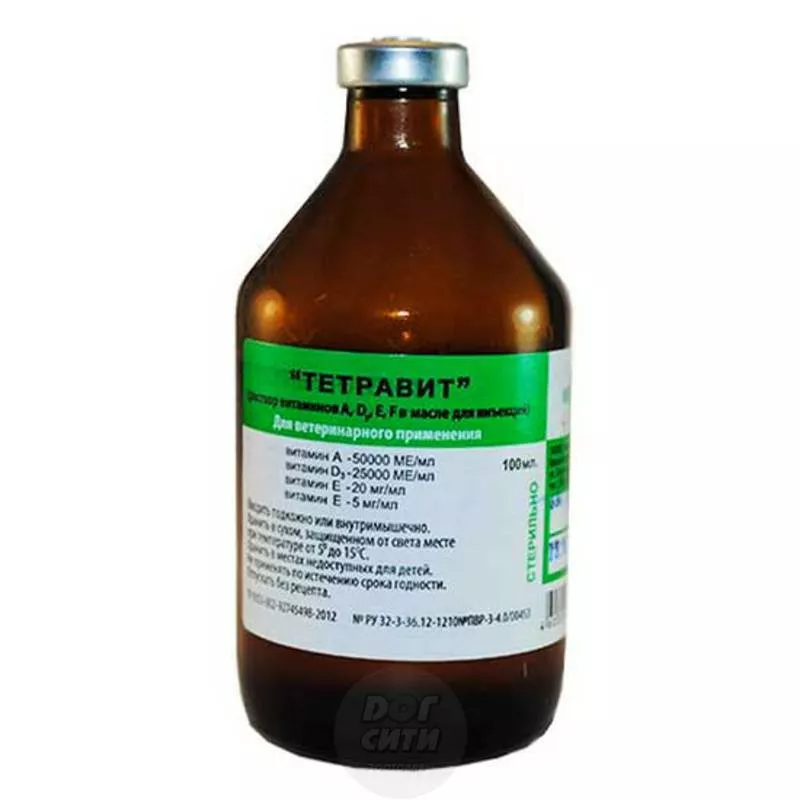 Состав: Тетравит – комплексный препарат с содержанием витаминов в 1 см3 раствора: А –50000 МЕ; D3 – 25000МЕ, Е –20мг и F – 5 мг.